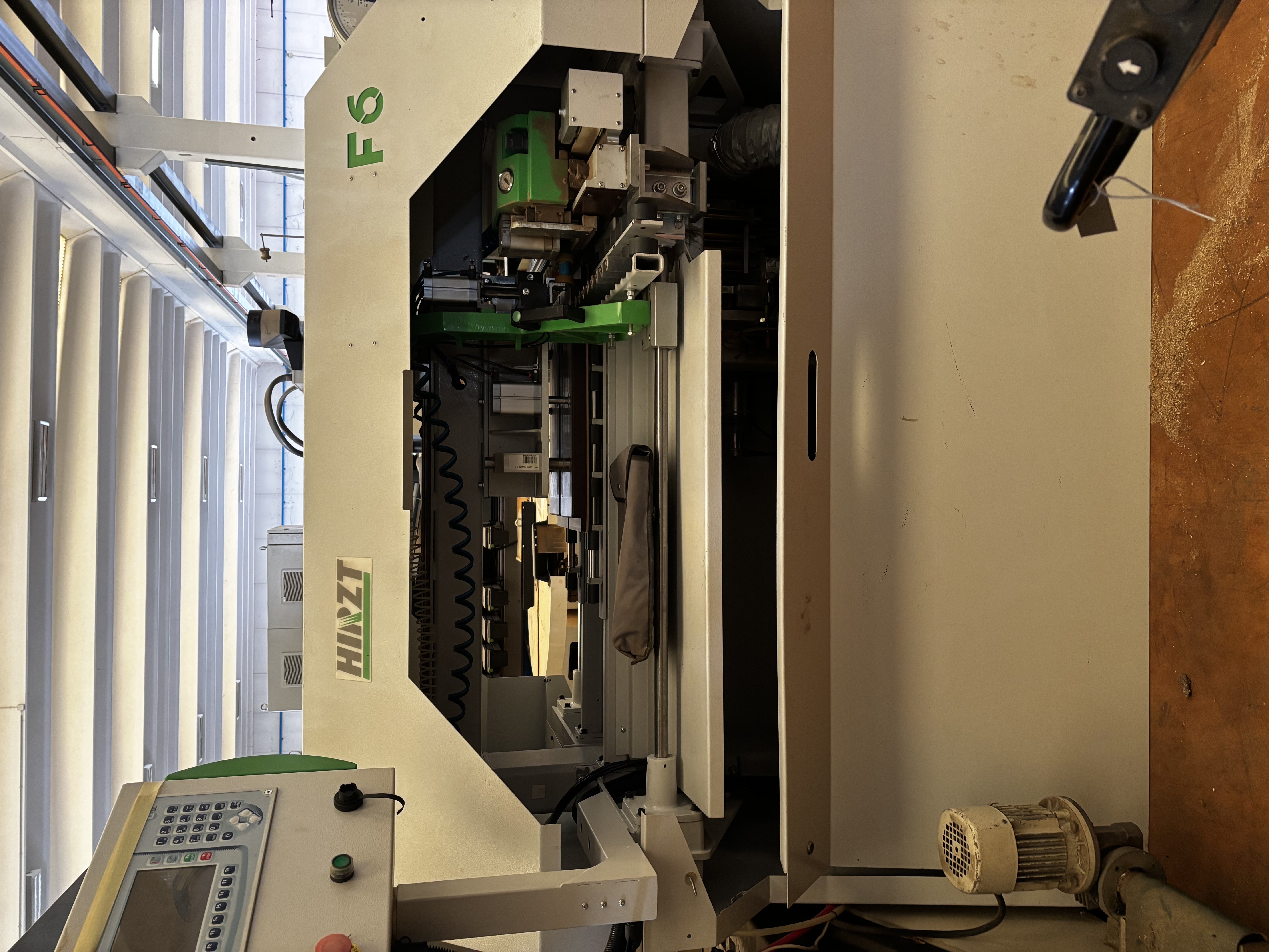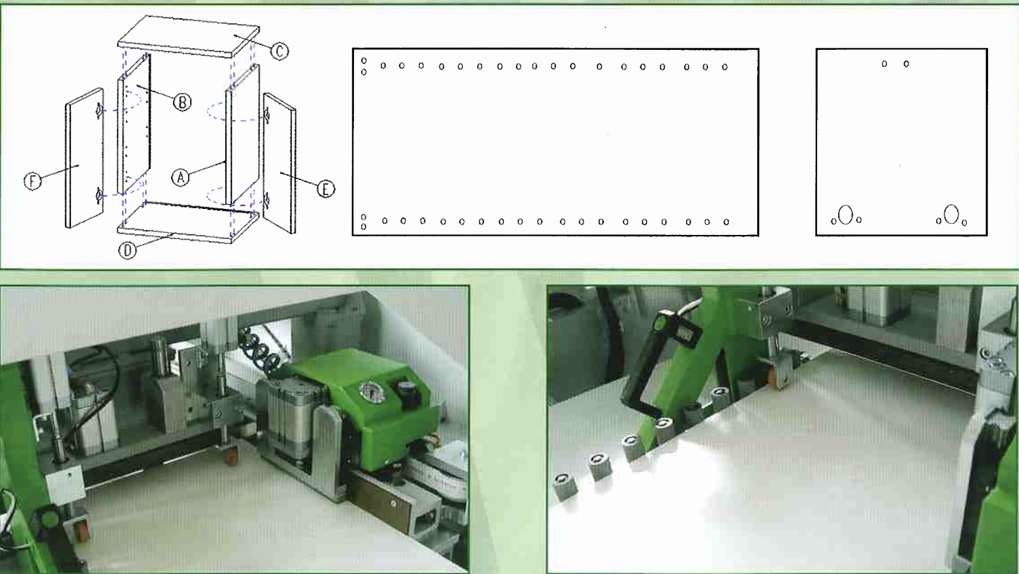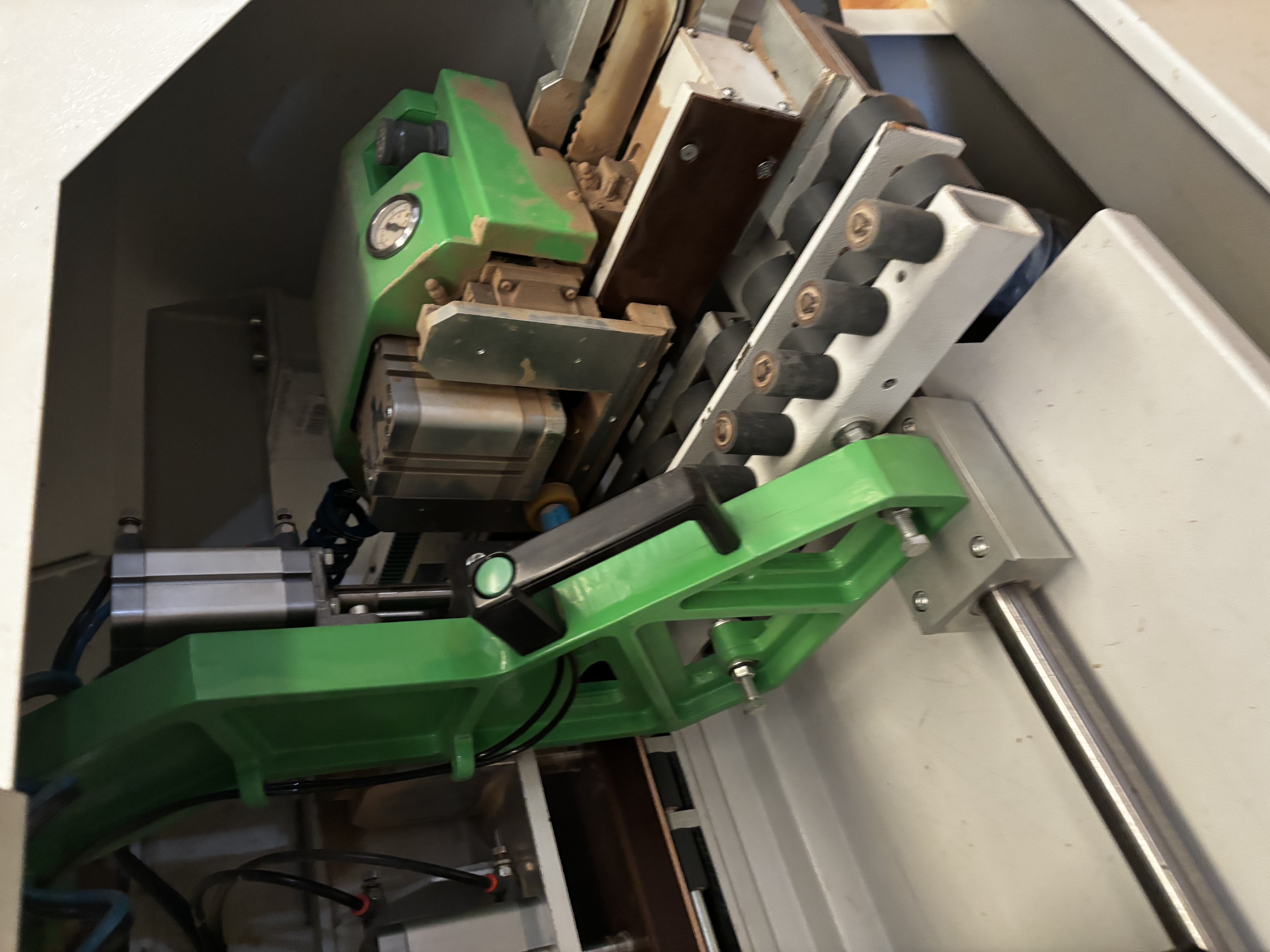 1st X-AXIS: Panel movement with pneumatic clamp, with a step-by-step system, without panel length limits. This system allows for a compact machine footprint, allowing it to be used even in small spaces.