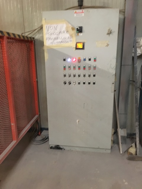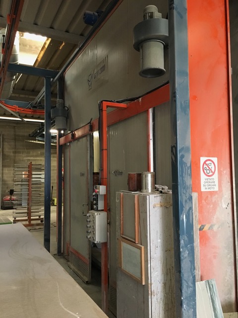 Impianto automatico per impregnatura e verniciatura dei serramenti, cabina di verniciatura.