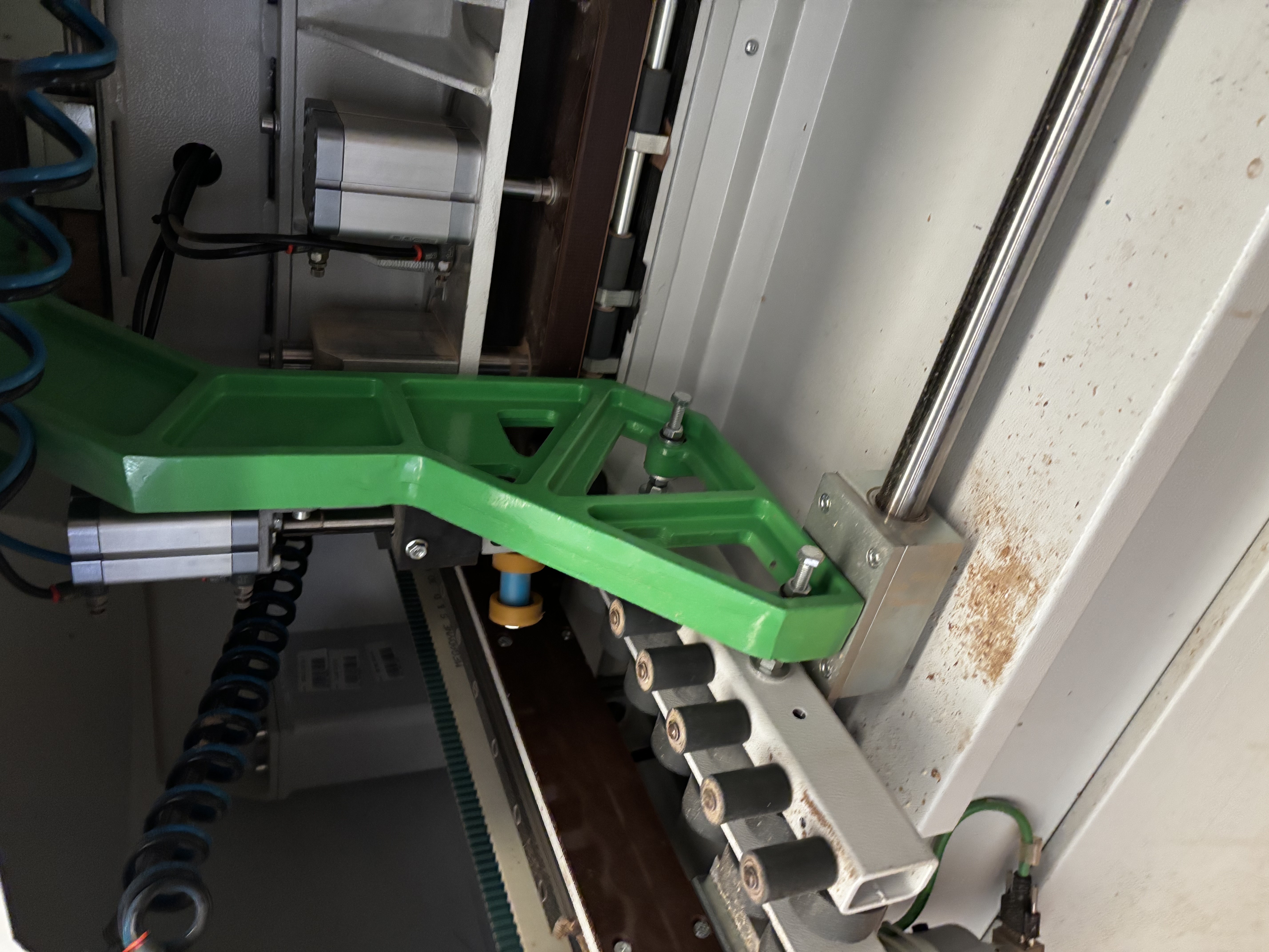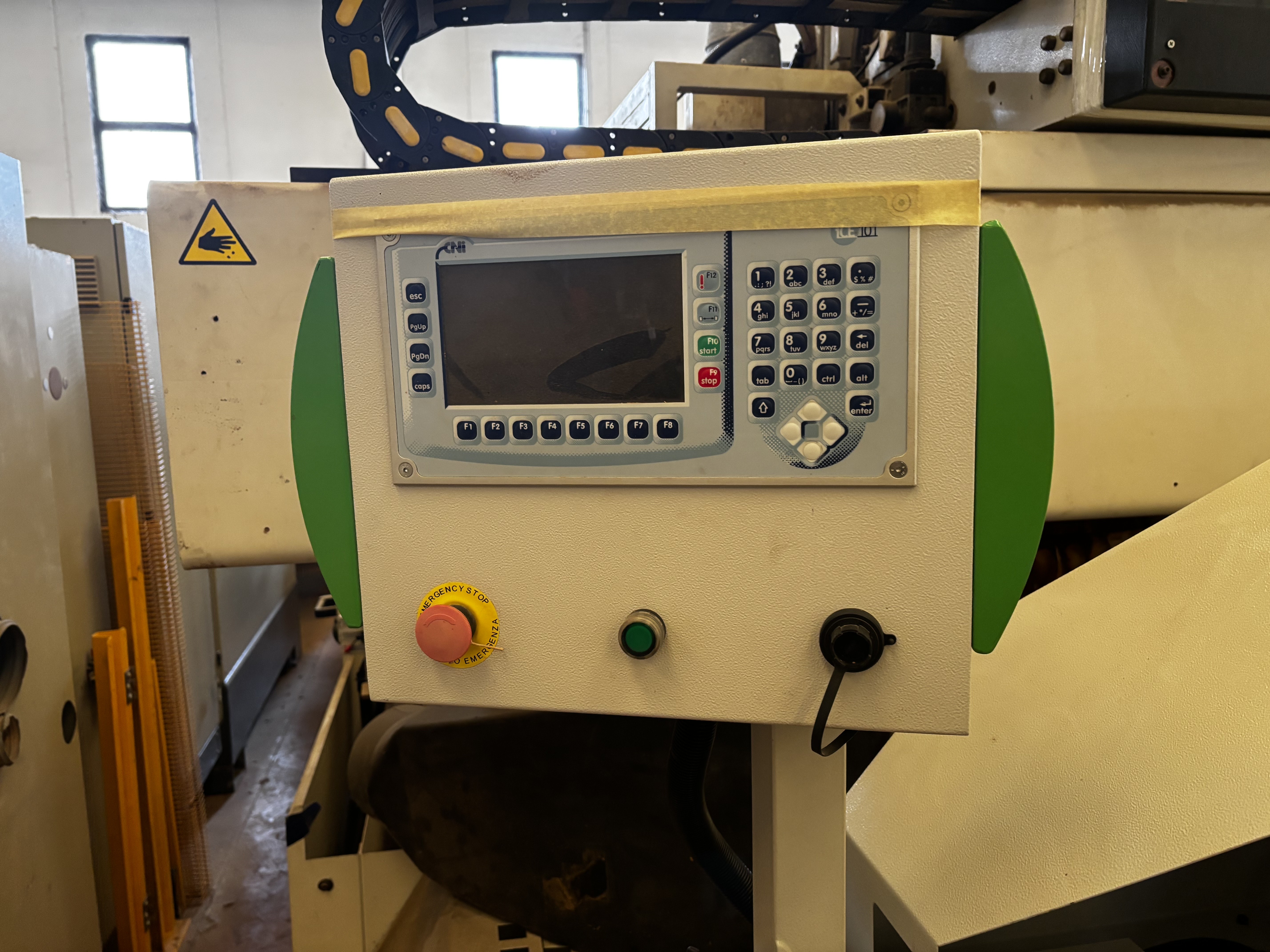 1° ASSE X : movimentazione pannello con pinza pneumatica, con sistema passo-passo, senza limiti di lunghezza pannello. Il sistema permette un ingombro della macchina contenuto, quindi utilizzabile anche in piccoli locali.